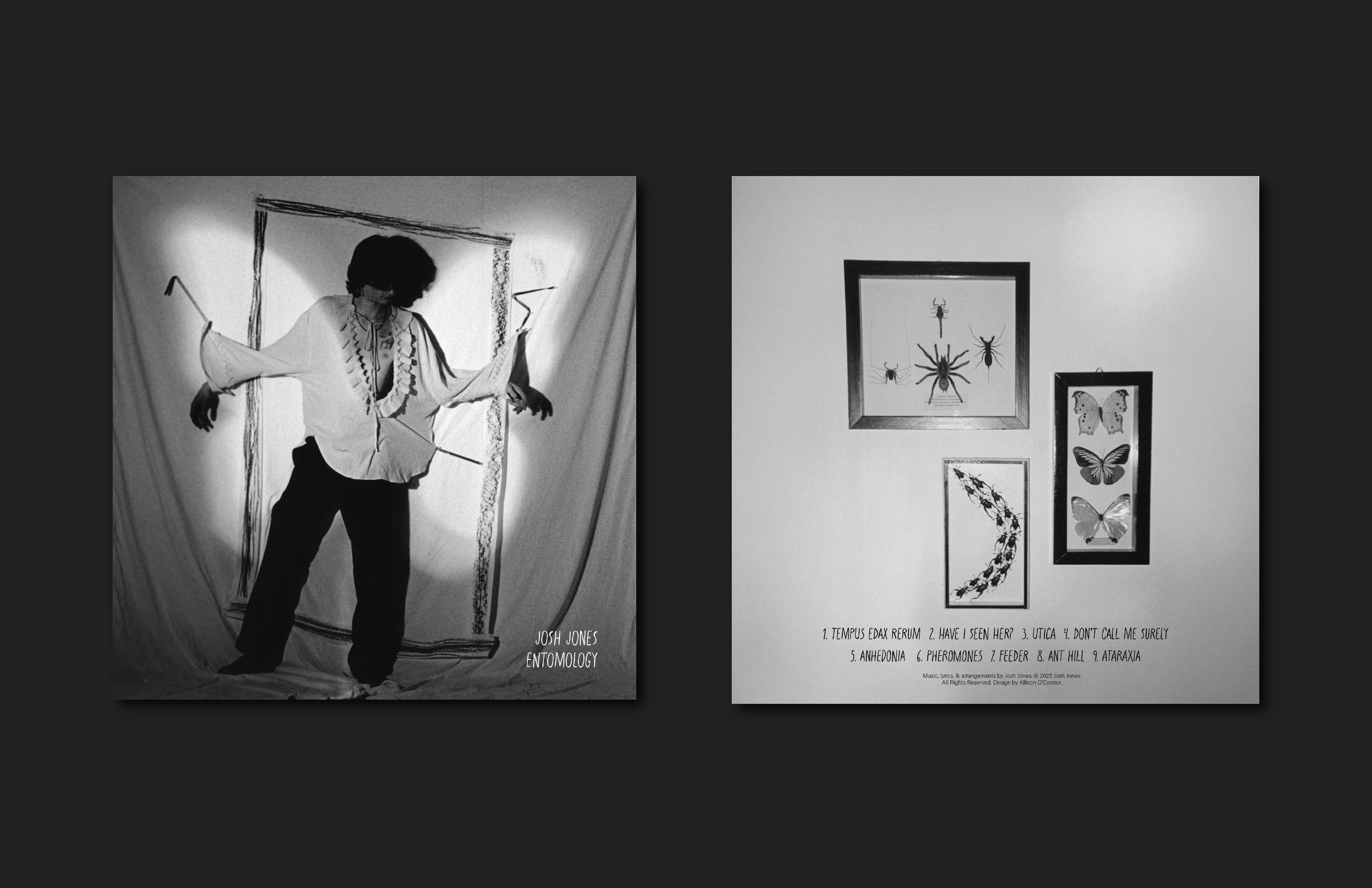 The album artwork for Entomology was shot on 35mm film and printed in the darkroom. The silhouette of the butterfly was achieved by dodging, a printing technique used to lighten a certain area during exposure.
